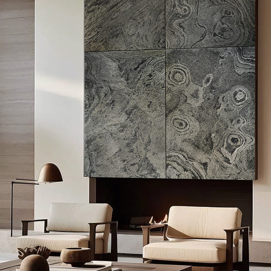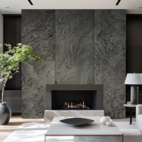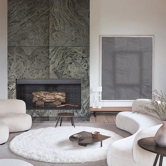 This stone surface exudes a sense of flowing movement with its organic, swirling patterns. The mix of muted green and subtle gray tones creates a textured landscape, reminiscent of gentle waves in a serene riverbed.