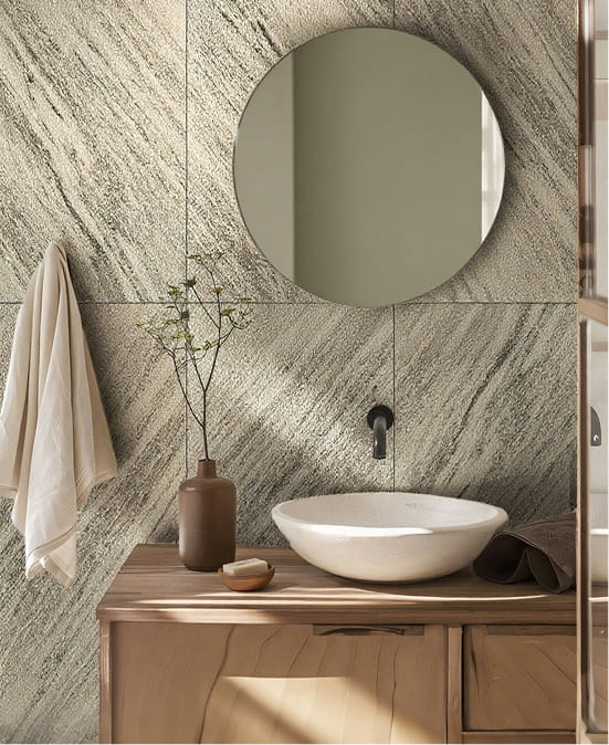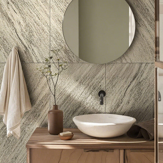 The Madanah series offers a 100% Statuario marble surface quarried in the Madhya Pradesh region of north India, an area famed for its naturally beautiful and hardy stone. Predominantly white with subtle graphite gray veining and spotting, this stone brings elegance to any space. With a simultaneously translucent and textured appearance, it works especially well when juxtaposed with classic traditional design elements. Especially durable, Isvara is suitable for both indoor and outdoor usage, and can be applied to hardwood, concrete, glass, metal and tile surfaces.
