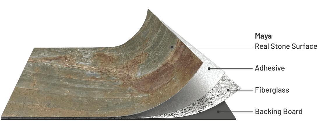 This slate stone is reminiscent of the light at dusk, with gray and red tones mixing with blue veins and dashes of copper. Ideal for a bold yet sophisticated look. Maya is sourced from our quarry in the Ranikhet mountains of India, and subsequently hand-cut and lightly polished. This natural gem is ultrathin and ultralight, making for easy DIY application, yet notably hardy and durable. Endlessly versatile, the product can be applied to almost any surface, including hardwood, concrete, glass, metal and tile.