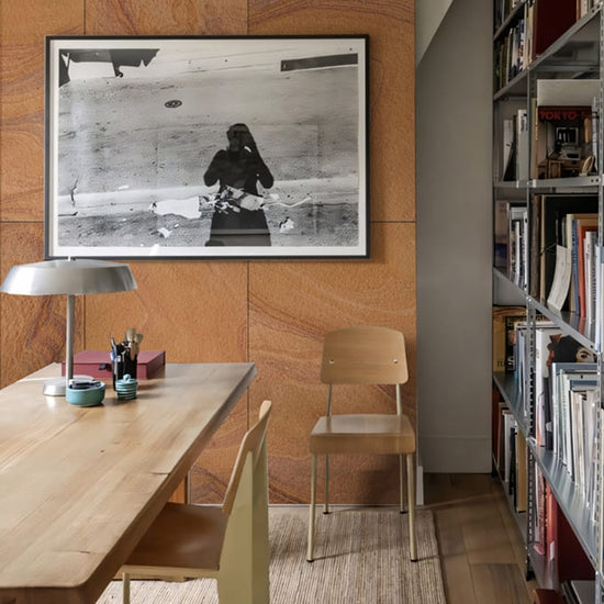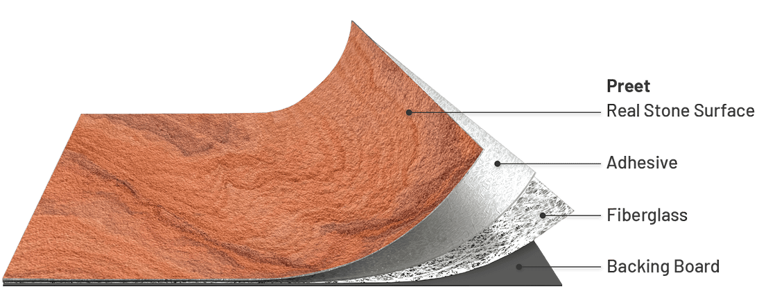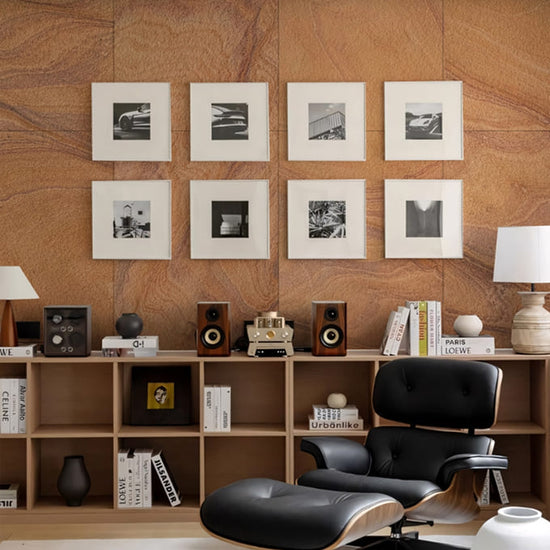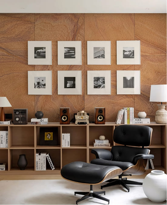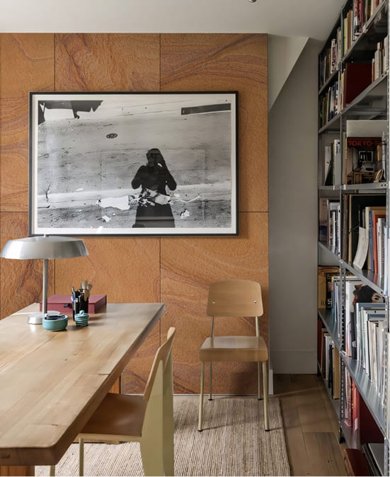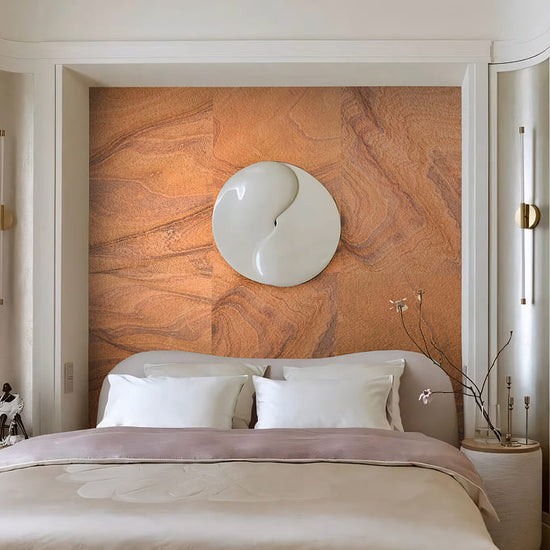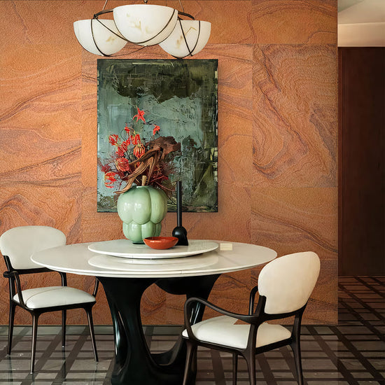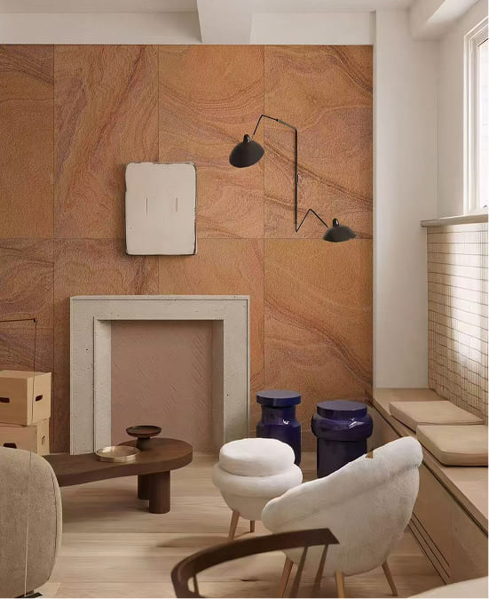 The intricate pattern of the stone in the image resembles a harmonious dance of colors, flowing like a natural rainbow etched in sandstone. Warm reddish-brown tones merge with terracotta hues, interwoven with golden veins, creating an earthy tapestry that exudes a sense of organic elegance and timeless beauty. The subtle gradients and lines evoke the ripples of ancient geological processes, offering a glimpse into nature's artistry. Our Preet series highlights a timeless elegance with a highly resilient surface hewn from 100% natural sandstone and hand-crafted by skilled artisans. Its intricate patterns and harmonious color palette of reddish-brown hues make Preet an excellent choice for cultural centers, residential projects, public landmarks, and places of worship. With its naturally low absorption and exceptional compression strength, Preet is perfectly suited for both interior and exterior applications, especially as wall cladding. This versatile and enduring material can be applied seamlessly to surfaces like hardwood, concrete, glass, metal, and tiles.