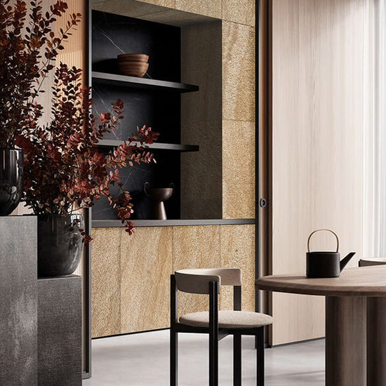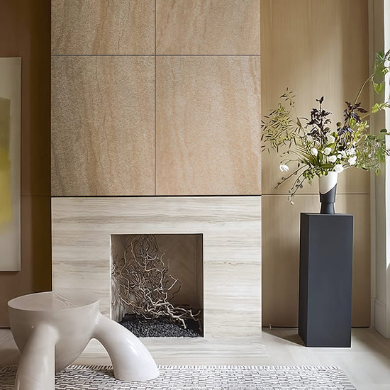 This sunny sandstone has yellow and beige undertones, plus burnt orange veins that recall the sun’s rays. Quarried at our facility in India’s Pahalgam mountains, our Savita series features a highly resilient surface hewn from 100% natural sandstone and hand-cut by expert craftsmen. Even graining and its refined color palette of creamy gray hues make Savita a popular choice for museums, university campuses, civic centers and houses of worship. Sandstone has naturally low levels of absorption and high compression strength, so Savita is equally suitable for both indoor and outdoor usage, particularly as cladding. This endlessly durable product can be applied to hardwood, concrete, glass, metal and tile surfaces.