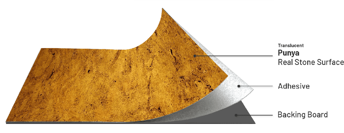 The natural slate layer has a 1/8" (3mm) thickness. Other layers consist of two layers of polyester resin. Our products have standard specifications and sizes. Each piece has a unique natural texture of the original slate. Materials have excellent flexibility, high malleability, and require low transportation costs. They are very cost-effective and very easy to install during construction even for DIY at home, with a very low loss rate. The backing-light series are highly recommended to apply to acrylic, plexiglass, lexan, and tempered glass to express the stone texture on the front of LED.