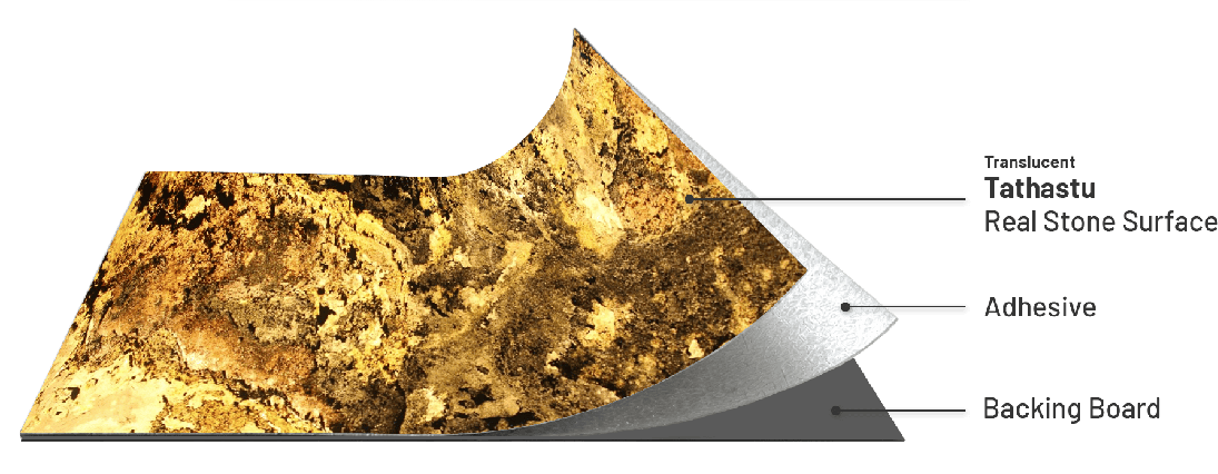 The natural slate layer has a 1/8" (3mm) thickness. Other layers consist of two layers of polyester resin. Our products have standard specifications and sizes. Each piece has a unique natural texture of the original slate. Materials have excellent flexibility, high malleability, and require low transportation costs. They are very cost-effective and very easy to install during construction even for DIY at home, with a very low loss rate. The backing-light series are highly recommended to apply to acrylic, plexiglass, lexan, and tempered glass to express the stone texture on the front of LED.