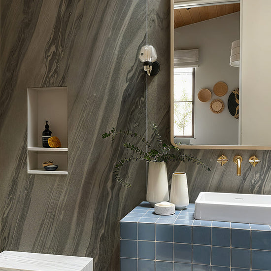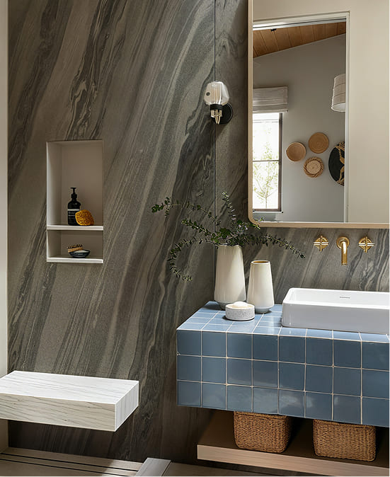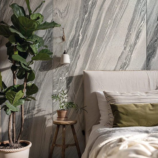The Aspara series offers a 100% Statuario marble surface quarried in the Madhya Pradesh region of north India, an area famed for its naturally beautiful and hardy stone. Predominantly white with subtle graphite gray veining and spotting, this stone brings elegance to any space. With a simultaneously translucent and textured appearance, it works especially well when juxtaposed with classic traditional design elements. Especially durable, Isvara is suitable for both indoor and outdoor usage, and can be applied to hardwood, concrete, glass, metal and tile surfaces.