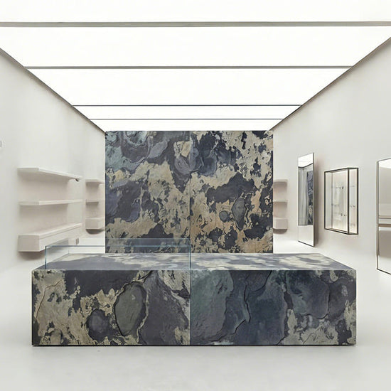 An ice blue sea furrowed by lightly golden waves, Tathastu is a dramatic stone that seduces onlookers with its fascinating combination of colors, providing them with an inner sense of calm and peacefulness. With its intriguing and complex appearance, Tathastu has become a favorite of renowned architects and interior designers seeking to create an especially refined space. Durable and yet also flexible, this stone is suitable for both indoor and outdoor usage, and can be applied to hardwood, concrete, glass, metal and tile surfaces.