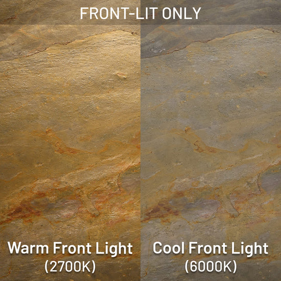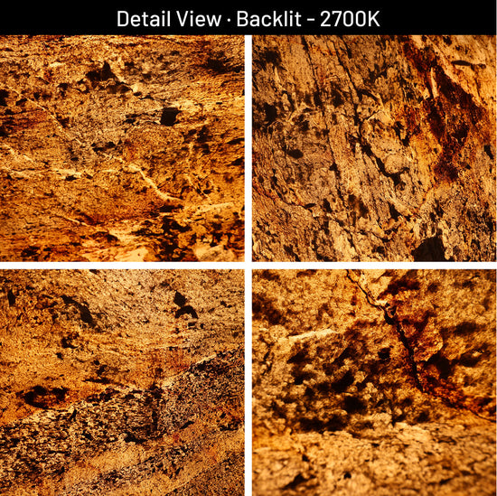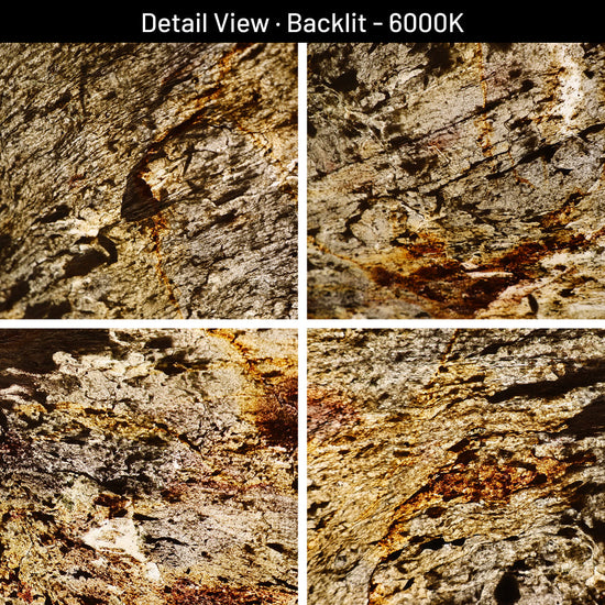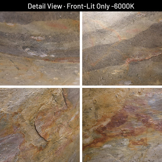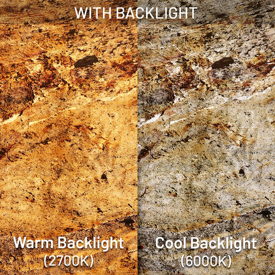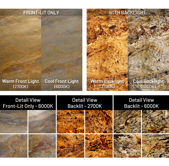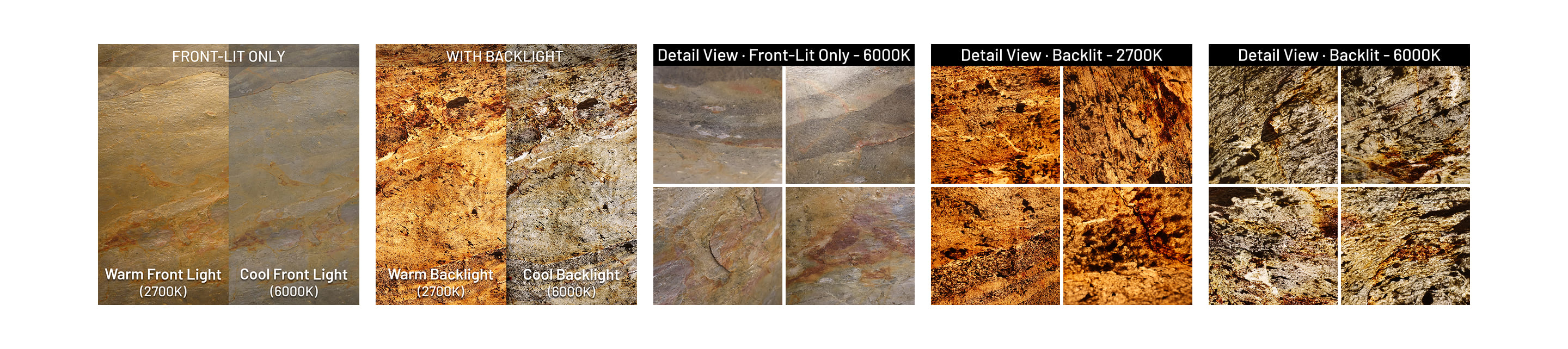 The natural slate layer has a 1/8" (3mm) thickness. Other layers consist of two layers of polyester resin. Our products have standard specifications and sizes. Each piece has a unique natural texture of the original slate. Materials have excellent flexibility, high malleability, and require low transportation costs. They are very cost-effective and very easy to install during construction even for DIY at home, with a very low loss rate. The backing-light series are highly recommended to apply to acrylic, plexiglass, lexan, and tempered glass to express the stone texture on the front of LED.