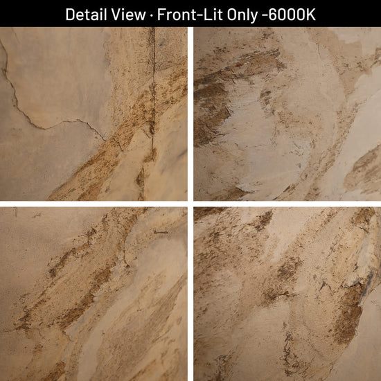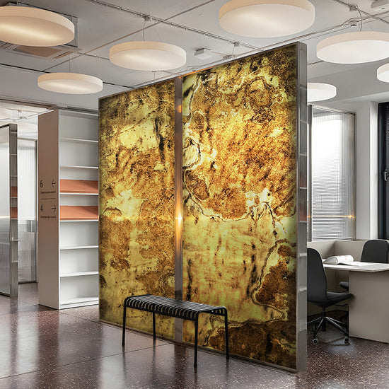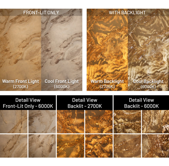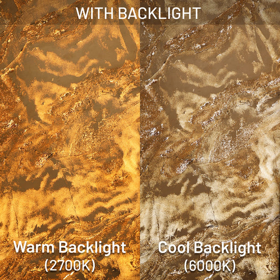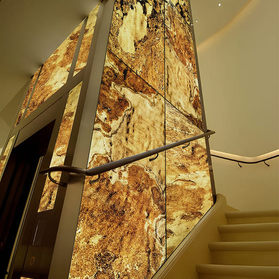 The natural slate layer has a 1/8" (3mm) thickness. Other layers consist of two layers of polyester resin. Our products have standard specifications and sizes. Each piece has a unique natural texture of the original slate. Materials have excellent flexibility, high malleability, and require low transportation costs. They are very cost-effective and very easy to install during construction even for DIY at home, with a very low loss rate. The backing-light series are highly recommended to apply to acrylic, plexiglass, lexan, and tempered glass to express the stone texture on the front of LED.