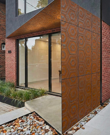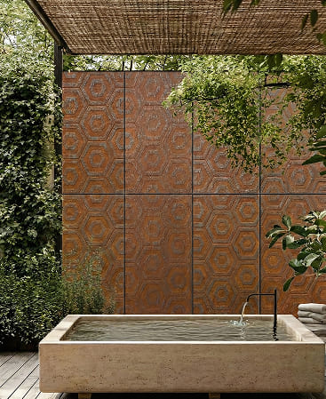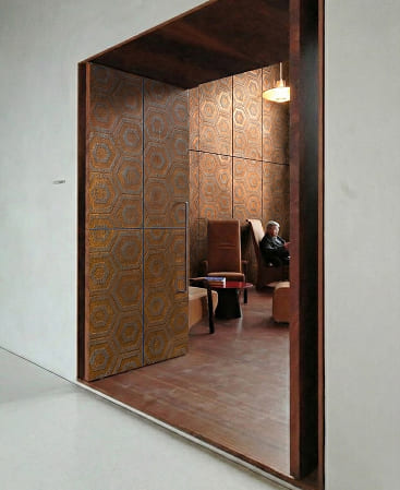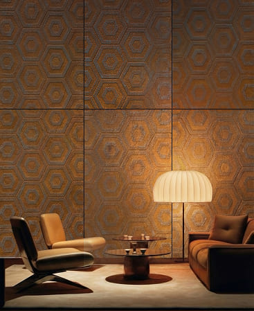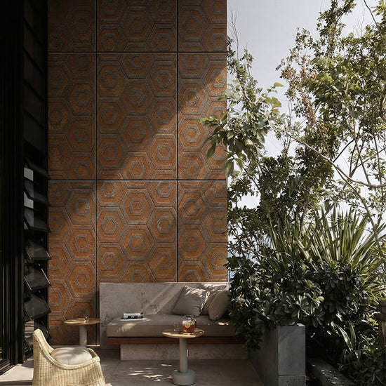 Rustic Hex features a striking hexagonal pattern with a warm, weathered metal appearance, blending industrial character with a refined rustic aesthetic. Inspired by aged steel and naturally developed patina, the geometric layout adds rhythm, depth, and architectural interest to any space.