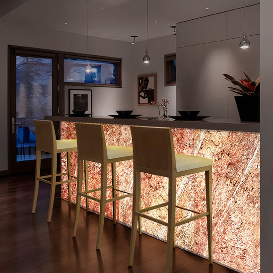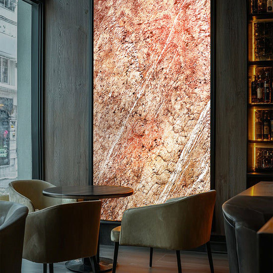 The natural slate layer has a 1/8" (3mm) thickness. Other layers consist of two layers of polyester resin. Our products have standard specifications and sizes. Each piece has a unique natural texture of the original slate. Materials have excellent flexibility, high malleability, and require low transportation costs. They are very cost-effective and very easy to install during construction even for DIY at home, with a very low loss rate. The backing-light series are highly recommended to apply to acrylic, plexiglass, lexan, and tempered glass to express the stone texture on the front of LED.